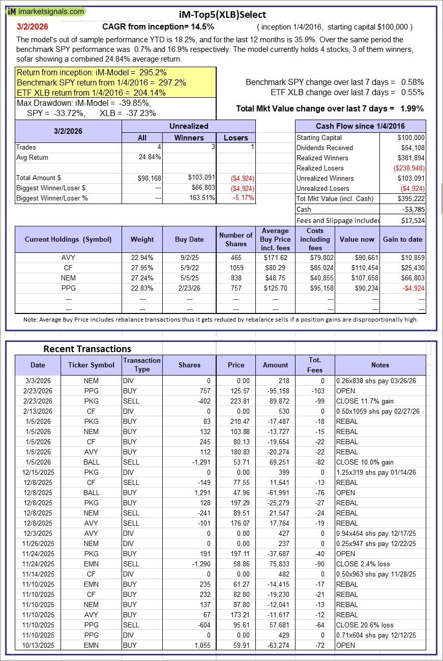 iM-Top5(XLB)Select: Since inception, on 1/5/2016, the model gained 295.22% while the benchmark SPY gained 297.24% over the same period. Over the previous week the market value of iM-Top5(XLB)Select gained 1.99% at a time when SPY gained 0.58%. A starting capital of $100,000 at inception on 1/5/2016 would have grown to $395,222 which includes -$3,785 cash and excludes $17,524 spent on fees and slippage. |