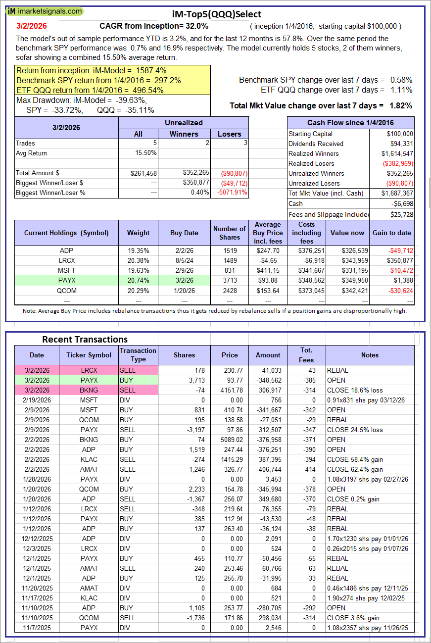 iM-Top5(QQQ)Select: Since inception, on 1/5/2016, the model gained 1587.37% while the benchmark SPY gained 297.24% over the same period. Over the previous week the market value of iM-Top5(QQQ)Select gained 1.82% at a time when SPY gained 0.58%. A starting capital of $100,000 at inception on 1/5/2016 would have grown to $1,687,367 which includes -$6,698 cash and excludes $25,728 spent on fees and slippage. |