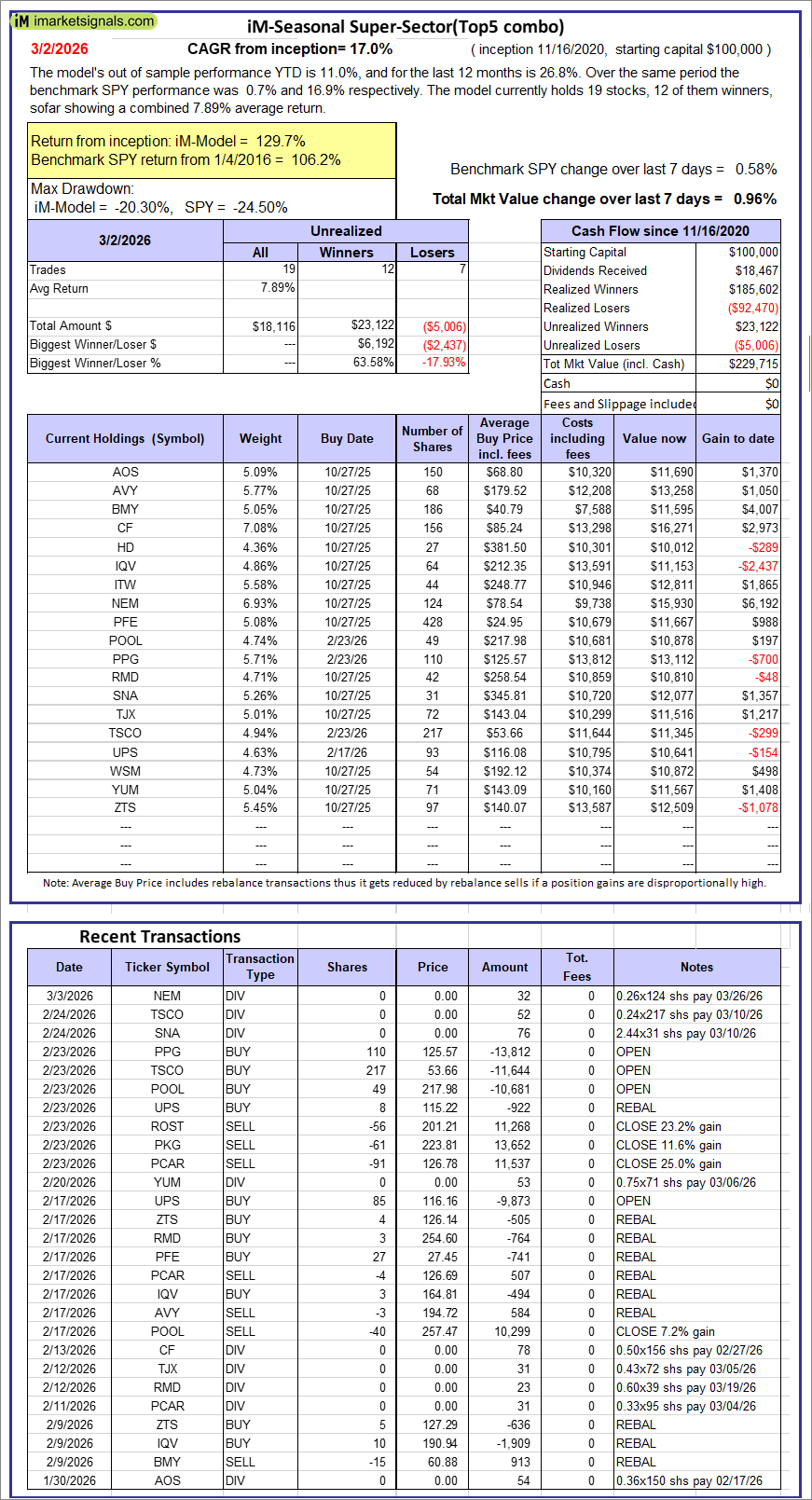 iM-Seasonal Super-Sectors (Top5 combo) : Since inception, on 11/17/2020, the model gained 129.72% while the benchmark SPY gained 106.21% over the same period. Over the previous week the market value of iM-Seasonal Super-Sectors (Top5 combo) gained 0.96% at a time when SPY gained 0.58%. A starting capital of $100,000 at inception on 11/17/2020 would have grown to $229,715 which includes $0 cash and excludes $00 spent on fees and slippage. |