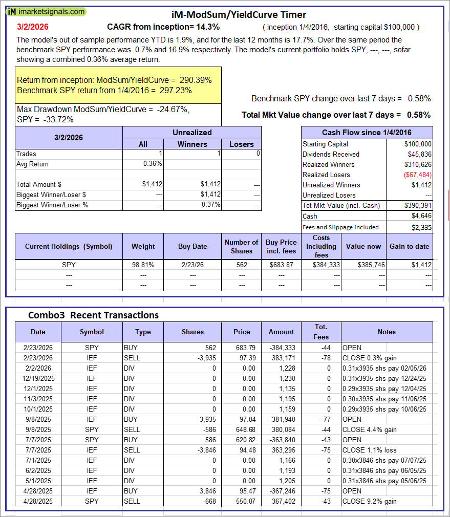 iM-ModSum/YieldCurve Timer: The model’s out of sample performance YTD is 1.9%, and for the last 12 months is 17.7%. Over the same period the benchmark SPY performance was 0.7% and 16.9% respectively. Over the previous week the market value of iM-PortSum/YieldCurve Timer gained 0.58% at a time when SPY gained 0.58%. A starting capital of $100,000 at inception on 1/1/2016 would have grown to $390,391 which includes $4,646 cash and excludes $2,335 spent on fees and slippage. |