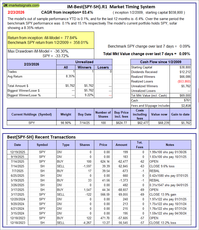iM-Best(SPY-SH).R1: The model’s out of sample performance YTD is 0.1%, and for the last 12 months is -6.4%. Over the same period the benchmark SPY performance was 0.1% and 15.1% respectively. Over the previous week the market value of Best(SPY-SH) gained 0.09% at a time when SPY gained 0.09%. A starting capital of $100,000 at inception on 1/2/2009 would have grown to $69,000 which includes $761 cash and excludes $2,818 spent on fees and slippage. |