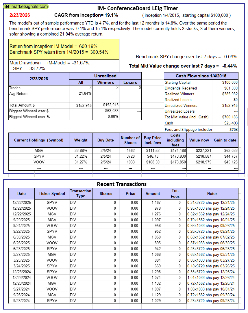iM-Conference Board LEIg Timer: The model’s performance YTD is 14.3%, and for the last 12 months is 7.3%. Over the same period the benchmark SPY performance was 20.1% and 9.4% respectively. Over the previous week the market value of the iM-Conference Board LEIg Timer gained -0.44% at a time when SPY gained 0.09%. A starting capital of $100,000 at inception on 4/5/2017 would have grown to $700,186 which includes $25,403 cash and excludes $763 spent on fees and slippage. |