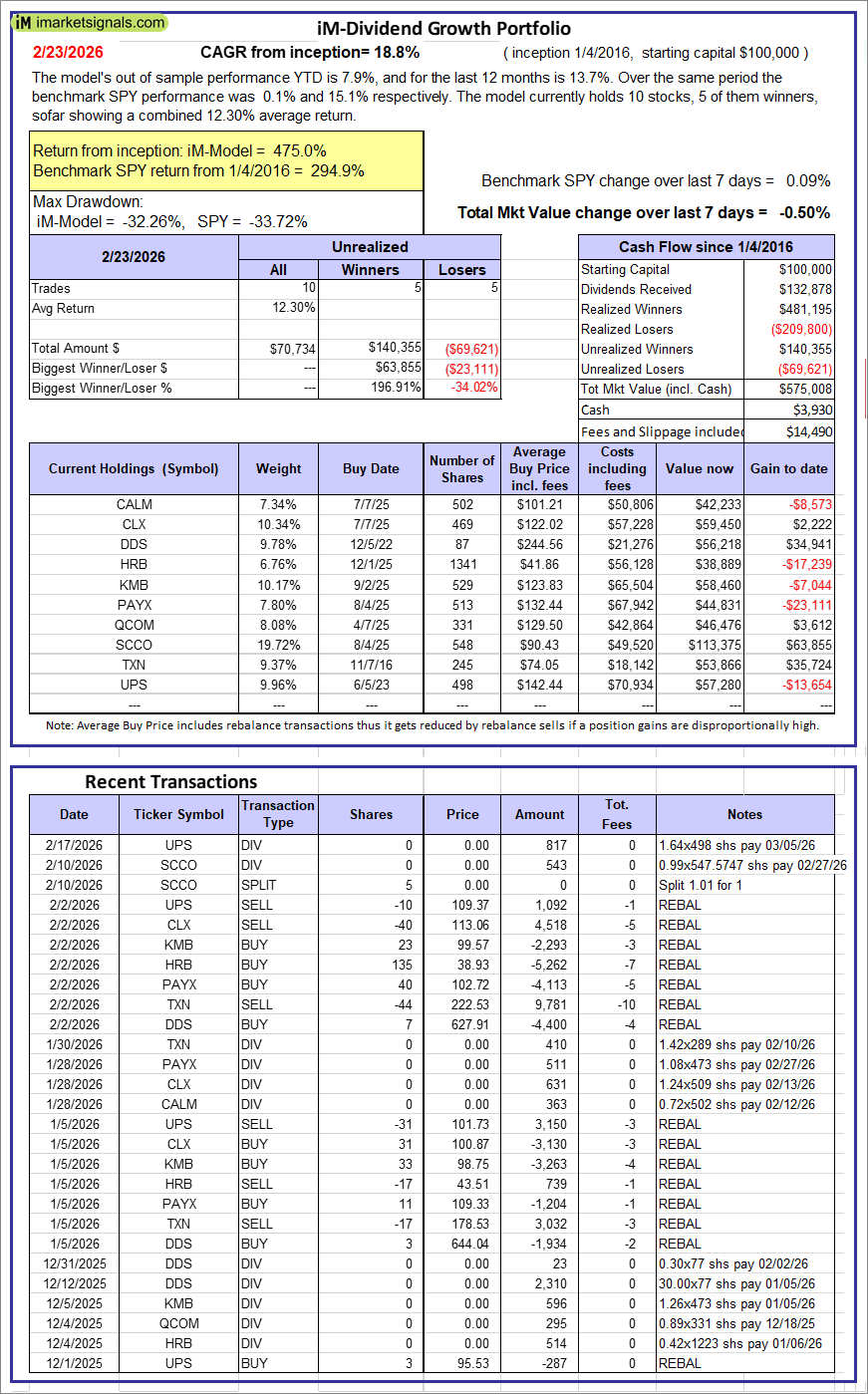 iM-Dividend Growth Portfolio: The model’s out of sample performance YTD is 7.9%, and for the last 12 months is 13.7%. Over the same period the benchmark SPY performance was 0.1% and 15.1% respectively. Over the previous week the market value of the iM-Dividend Growth Portfolio gained -0.50% at a time when SPY gained 0.09%. A starting capital of $100,000 at inception on 6/30/2016 would have grown to $575,008 which includes $3,930 cash and excludes $14,490 spent on fees and slippage. |