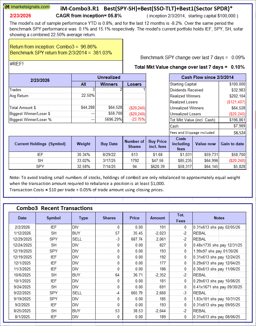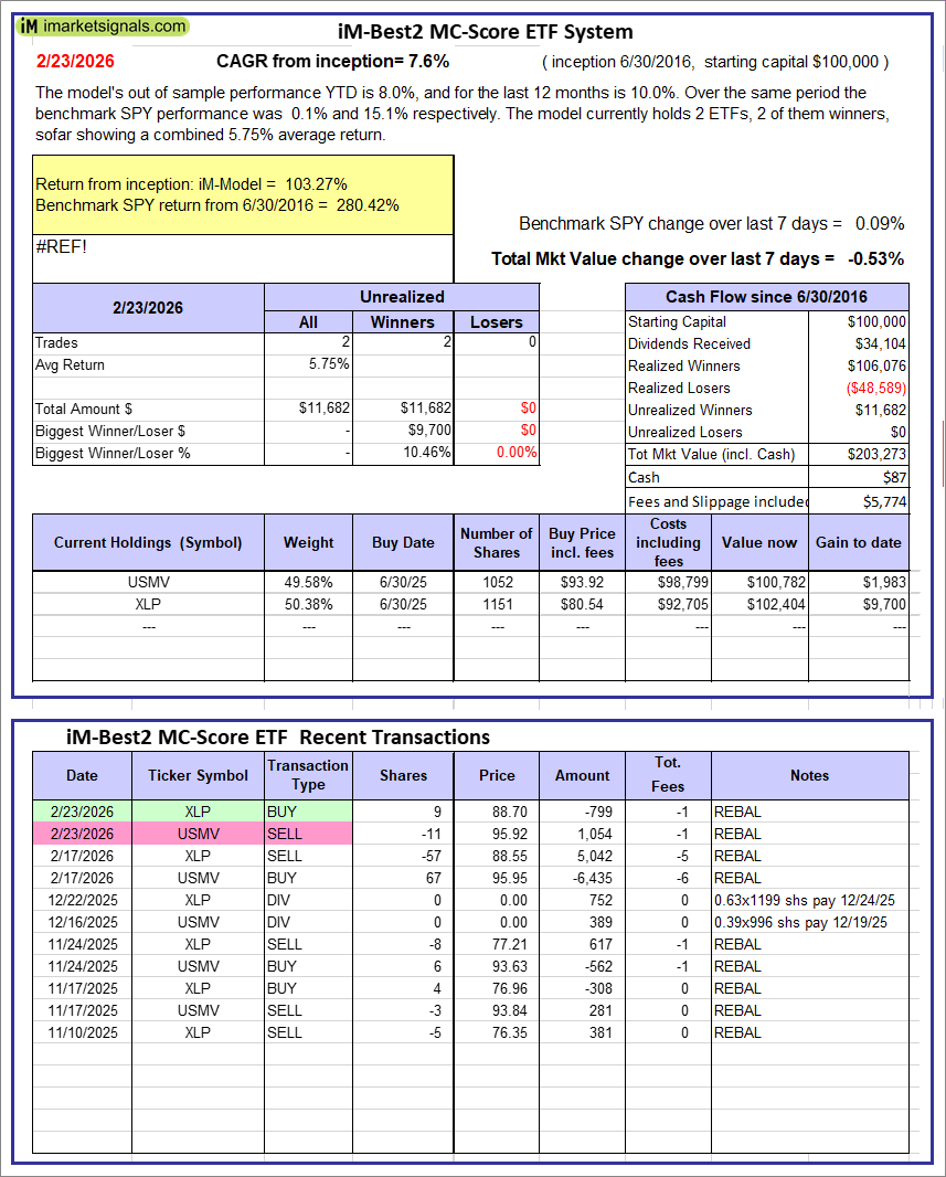 iM-Best2 MC-Score ETF System: The model’s out of sample performance YTD is 8.0%, and for the last 12 months is 10.0%. Over the same period the benchmark SPY performance was 0.1% and 15.1% respectively. Over the previous week the market value of the iM-Best2 MC-Score ETF System gained -0.53% at a time when SPY gained 0.09%. A starting capital of $100,000 at inception on 6/30/2016 would have grown to $203,273 which includes $87 cash and excludes $5,774 spent on fees and slippage. |
