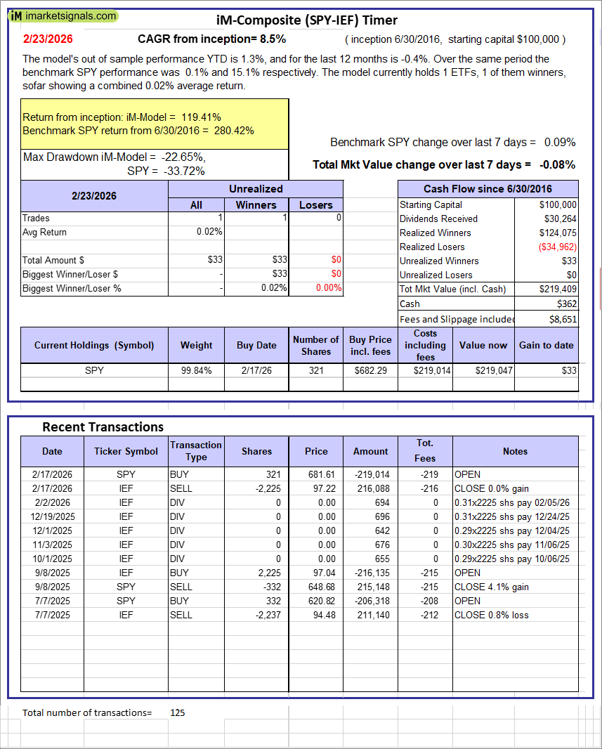 iM-Composite (SPY-IEF) Timer: The model’s out of sample performance YTD is 1.3%, and for the last 12 months is -0.4%. Over the same period the benchmark SPY performance was 0.1% and 15.1% respectively. Over the previous week the market value of the iM-Composite (SPY-IEF) Timer gained -0.08% at a time when SPY gained 0.09%. A starting capital of $100,000 at inception on 6/30/2016 would have grown to $219,409 which includes $362 cash and excludes $8,651 spent on fees and slippage. |