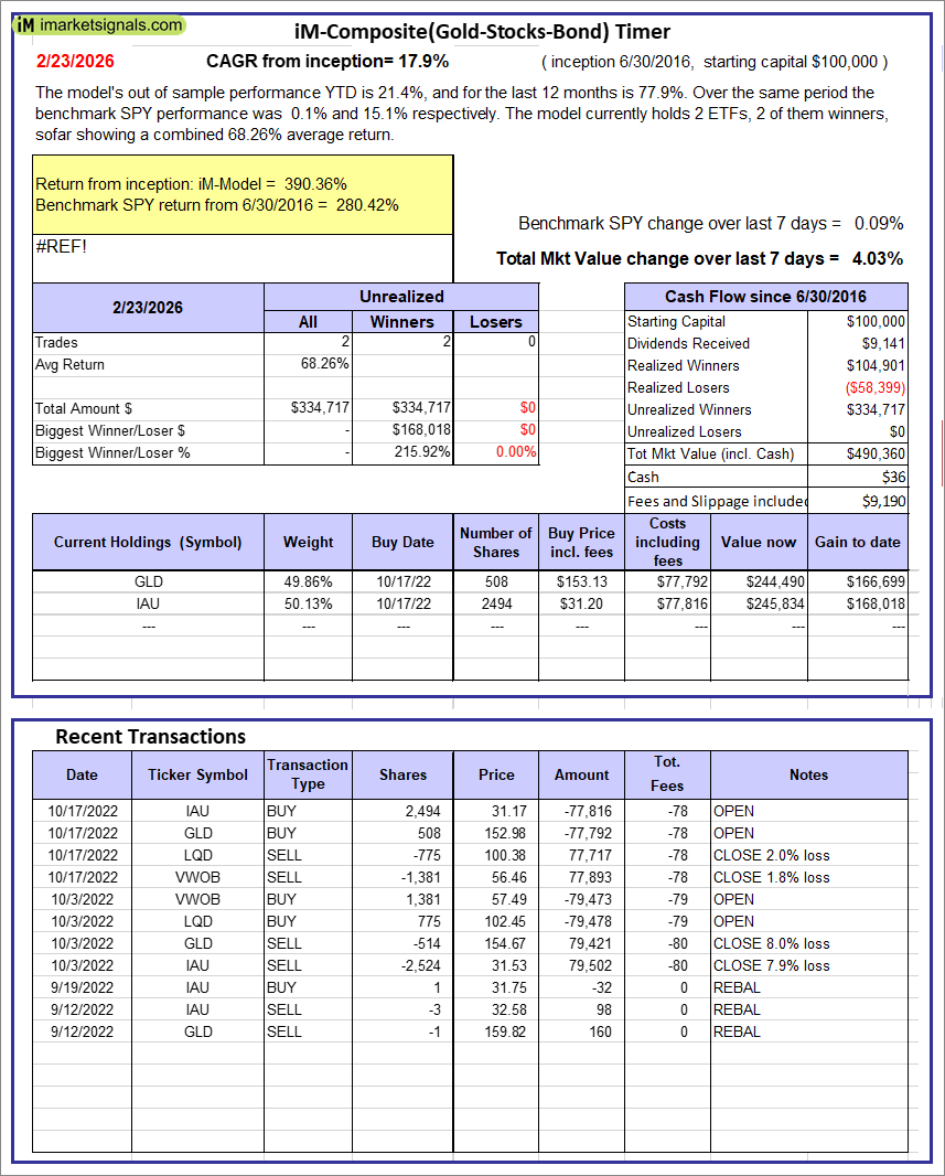 iM-Composite(Gold-Stocks-Bond) Timer: The model’s out of sample performance YTD is 21.4%, and for the last 12 months is 77.9%. Over the same period the benchmark SPY performance was 0.1% and 15.1% respectively. Over the previous week the market value of the iM-Composite(Gold-Stocks-Bond) Timer gained 4.03% at a time when SPY gained 0.09%. A starting capital of $100,000 at inception on 6/30/2016 would have grown to $490,360 which includes $36 cash and excludes $9,190 spent on fees and slippage. |