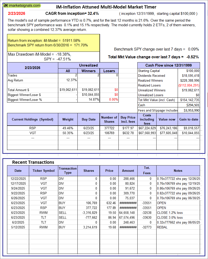 iM-Inflation Attuned Multi-Model Market Timer: The model’s out of sample performance YTD is 0.7%, and for the last 12 months is 21.6%. Over the same period the benchmark SPY performance was 0.1% and 15.1% respectively. Over the previous week the market value of the iM-Inflation Attuned Multi-Model Market Timer gained -0.52% at a time when SPY gained 0.09%. A starting capital of $100,000 at inception on 3/24/2017 would have grown to $154,142,735 which includes $294,501 cash and excludes $3,953,990 spent on fees and slippage. |