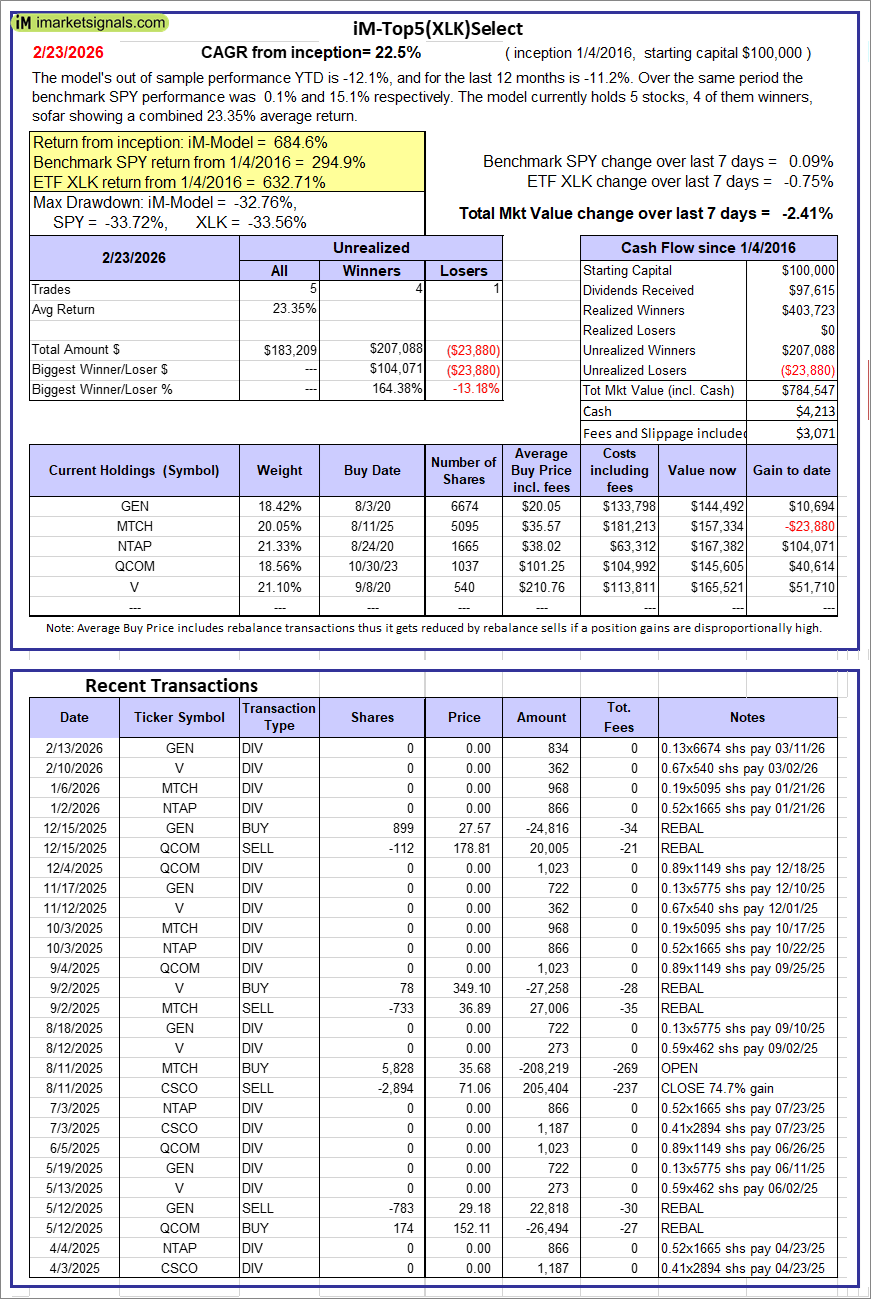 iM-Top5(XLK)Select: Since inception, on 1/5/2016, the model gained 684.55% while the benchmark SPY gained 294.93% over the same period. Over the previous week the market value of iM-Top5(XLK)Select gained -2.41% at a time when SPY gained 0.09%. A starting capital of $100,000 at inception on 1/5/2016 would have grown to $784,547 which includes $4,213 cash and excludes $3,071 spent on fees and slippage. |