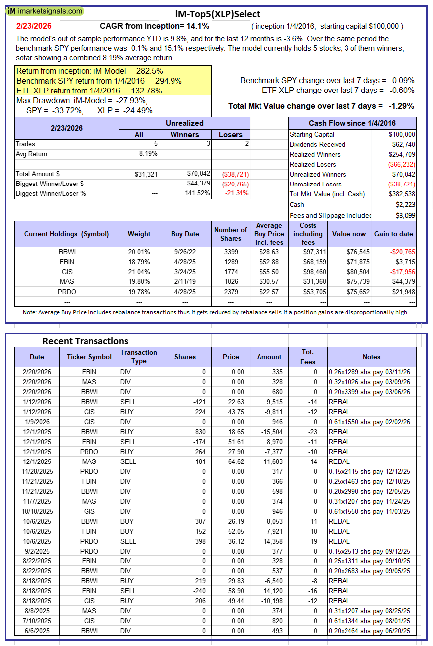 iM-Top5(XLP)Select: Since inception, on 1/5/2016, the model gained 282.54% while the benchmark SPY gained 294.93% over the same period. Over the previous week the market value of iM-Top5(XLP)Select gained -1.29% at a time when SPY gained 0.09%. A starting capital of $100,000 at inception on 1/5/2016 would have grown to $382,538 which includes $2,223 cash and excludes $3,099 spent on fees and slippage. |