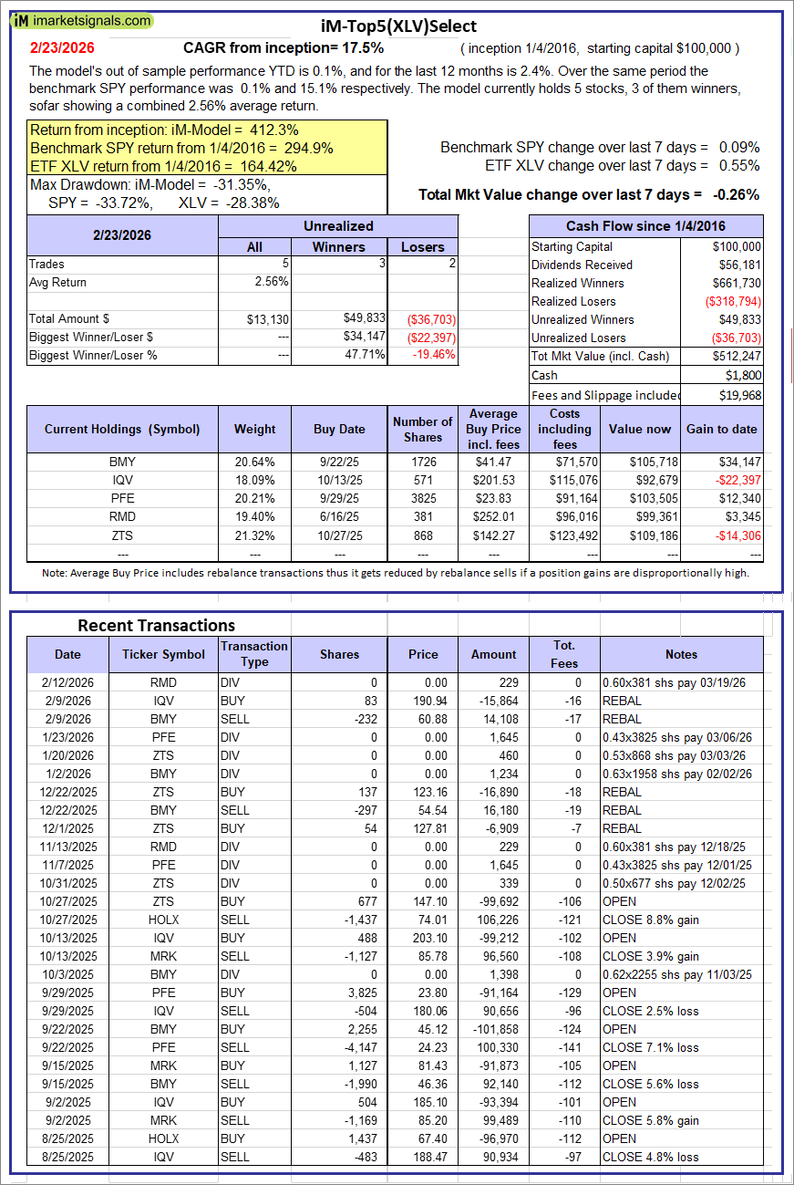 iM-Top5(XLV)Select: Since inception, on 1/5/2016, the model gained 412.25% while the benchmark SPY gained 294.93% over the same period. Over the previous week the market value of iM-Top5(XLV)Select gained -0.26% at a time when SPY gained 0.09%. A starting capital of $100,000 at inception on 1/5/2016 would have grown to $512,247 which includes $1,800 cash and excludes $19,968 spent on fees and slippage. |