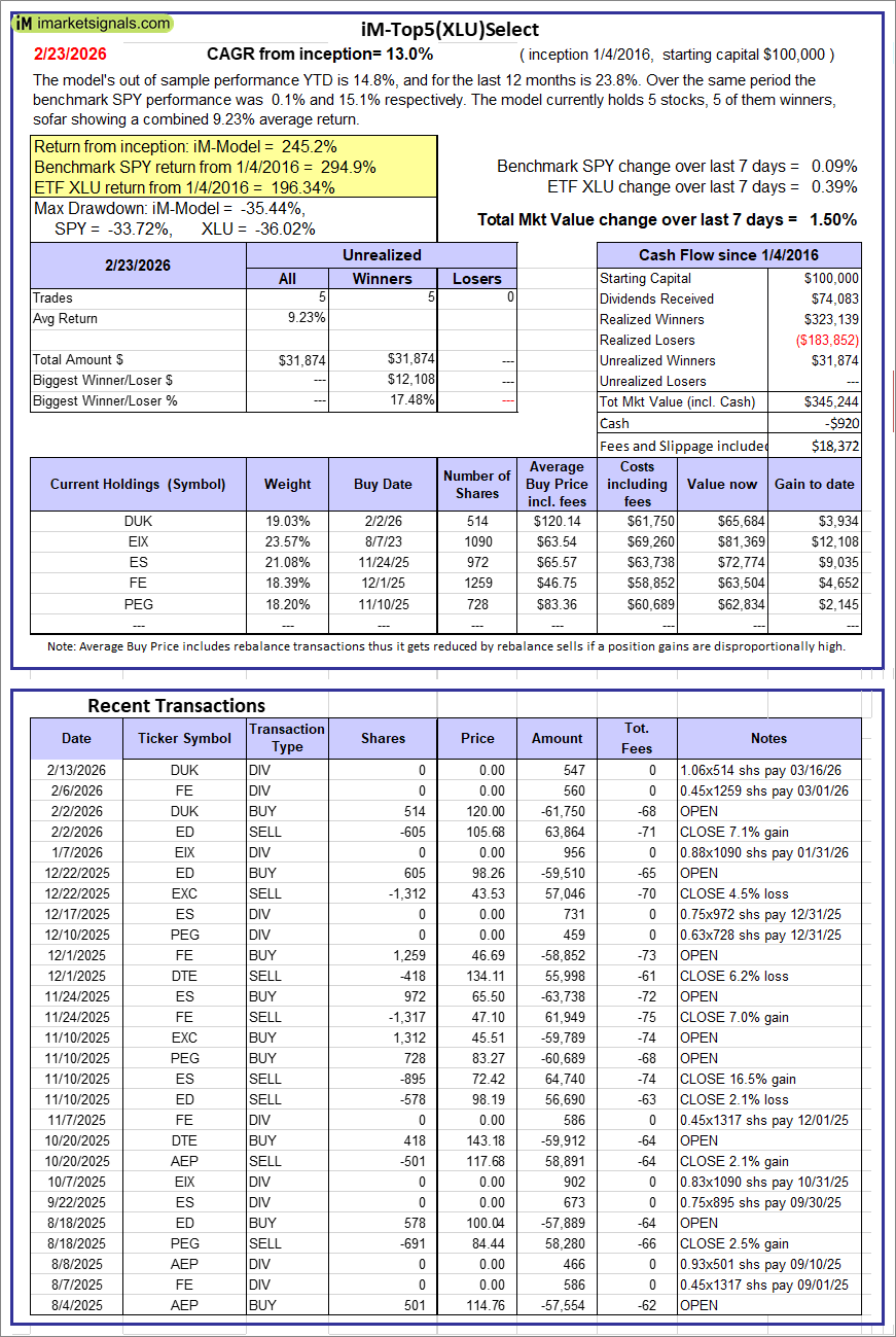 iM-Top5(XLU)Select: Since inception, on 1/5/2016, the model gained 245.24% while the benchmark SPY gained 294.93% over the same period. Over the previous week the market value of iM-Top5(XLU)Select gained 1.50% at a time when SPY gained 0.09%. A starting capital of $100,000 at inception on 1/5/2016 would have grown to $345,244 which includes -$920 cash and excludes $18,372 spent on fees and slippage. |