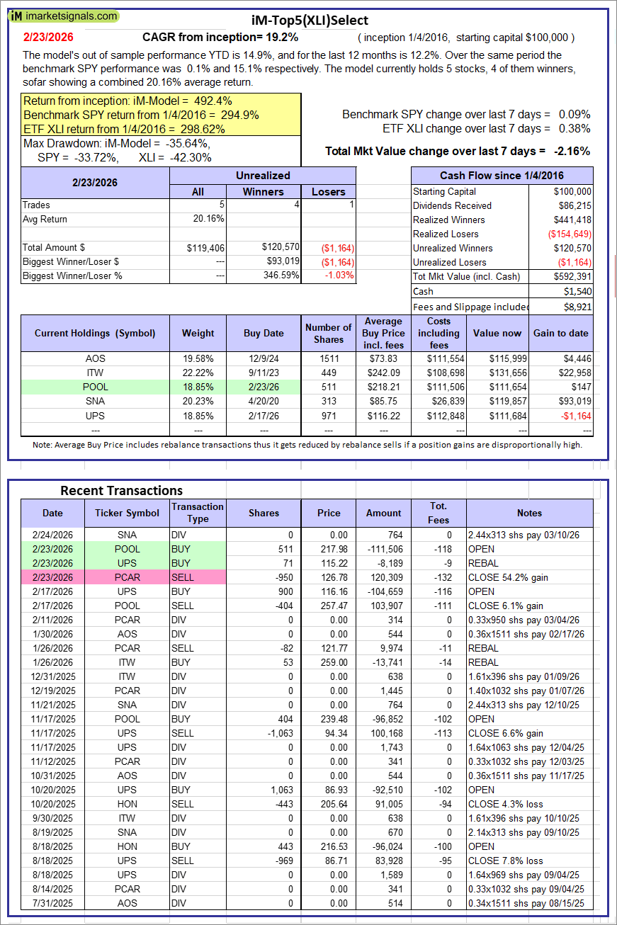 iM-Top5(XLI)Select: Since inception, on 1/5/2016, the model gained 492.39% while the benchmark SPY gained 294.93% over the same period. Over the previous week the market value of iM-Top5(XLI)Select gained -2.16% at a time when SPY gained 0.09%. A starting capital of $100,000 at inception on 1/5/2016 would have grown to $592,391 which includes $1,540 cash and excludes $8,921 spent on fees and slippage. |