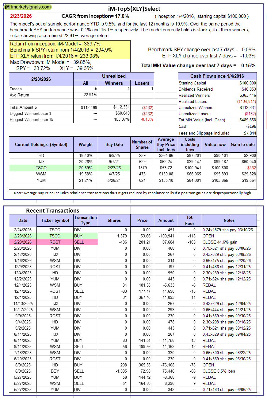 iM-Top5(XLY)Select: Since inception, on 1/5/2016, the model gained 389.66% while the benchmark SPY gained 294.93% over the same period. Over the previous week the market value of iM-Top5(XLY)Select gained -0.15% at a time when SPY gained 0.09%. A starting capital of $100,000 at inception on 1/5/2016 would have grown to $489,658 which includes -$196 cash and excludes $7,844 spent on fees and slippage. |
