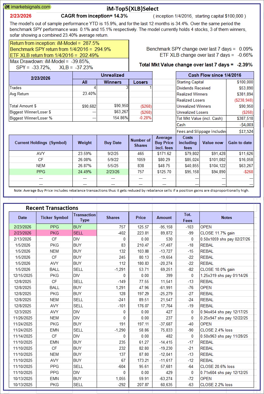 iM-Top5(XLB)Select: Since inception, on 1/5/2016, the model gained 287.52% while the benchmark SPY gained 294.93% over the same period. Over the previous week the market value of iM-Top5(XLB)Select gained -2.39% at a time when SPY gained 0.09%. A starting capital of $100,000 at inception on 1/5/2016 would have grown to $387,518 which includes -$4,003 cash and excludes $17,524 spent on fees and slippage. |