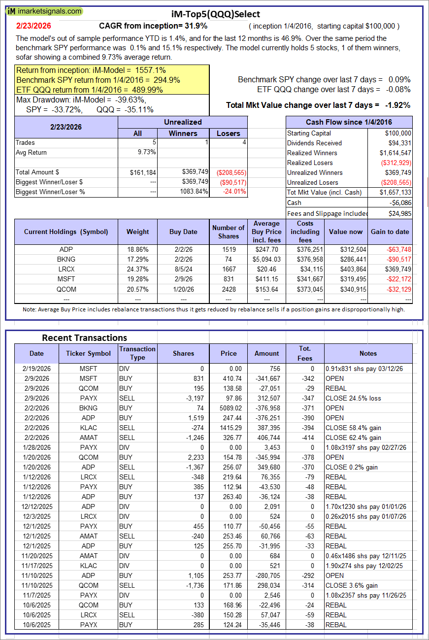 iM-Top5(QQQ)Select: Since inception, on 1/5/2016, the model gained 1557.13% while the benchmark SPY gained 294.93% over the same period. Over the previous week the market value of iM-Top5(QQQ)Select gained -1.92% at a time when SPY gained 0.09%. A starting capital of $100,000 at inception on 1/5/2016 would have grown to $1,657,133 which includes -$6,086 cash and excludes $24,985 spent on fees and slippage. |