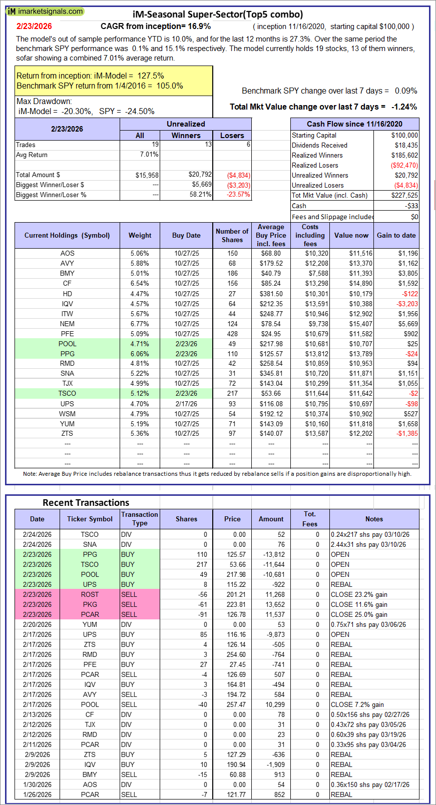 iM-Seasonal Super-Sectors (Top5 combo) : Since inception, on 11/17/2020, the model gained 127.53% while the benchmark SPY gained 105.01% over the same period. Over the previous week the market value of iM-Seasonal Super-Sectors (Top5 combo) gained -1.24% at a time when SPY gained 0.09%. A starting capital of $100,000 at inception on 11/17/2020 would have grown to $227,525 which includes -$33 cash and excludes $00 spent on fees and slippage. |