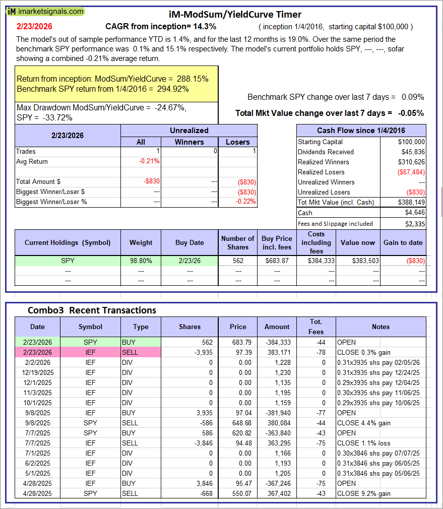 iM-ModSum/YieldCurve Timer: The model’s out of sample performance YTD is 1.4%, and for the last 12 months is 19.0%. Over the same period the benchmark SPY performance was 0.1% and 15.1% respectively. Over the previous week the market value of iM-PortSum/YieldCurve Timer gained -0.05% at a time when SPY gained 0.09%. A starting capital of $100,000 at inception on 1/1/2016 would have grown to $388,149 which includes $4,646 cash and excludes $2,335 spent on fees and slippage. |