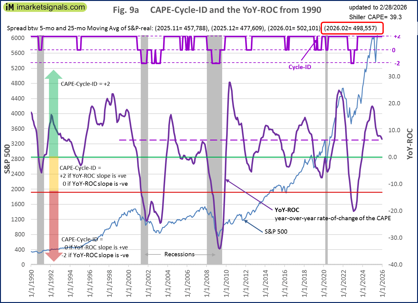 Fig 9a depicts the CAPE-Cycle-ID and the year-on-year rate-of-change of the Shiller CAPE; the level switched from -2 to 0 end of June 2023 generating a buy signal. This indicator now invested in the markets. This indicator is described here.