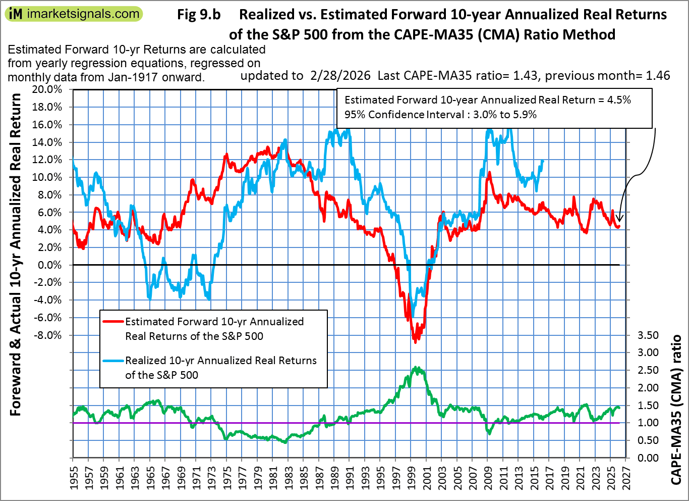 The estimated forward 10‐year annualized real return is 4.5% (previous month 4.4%) with a 95% confidence interval 3.0% to 5.9% (2.9% to 5.9%). Also refer to the Realized Forward 10-Year Returns vs. Inflation Rate