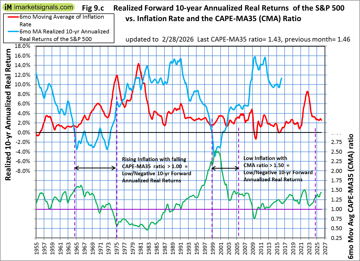 We may be in a rising inflation period with a falling CAPE-MA35 ratio similar to 1964-1973. This implies very low or negative 10 year forward annualized real returns, much lower than the returns indicated by regression analysis shown in the Estimated Forward 10-Year Returns.