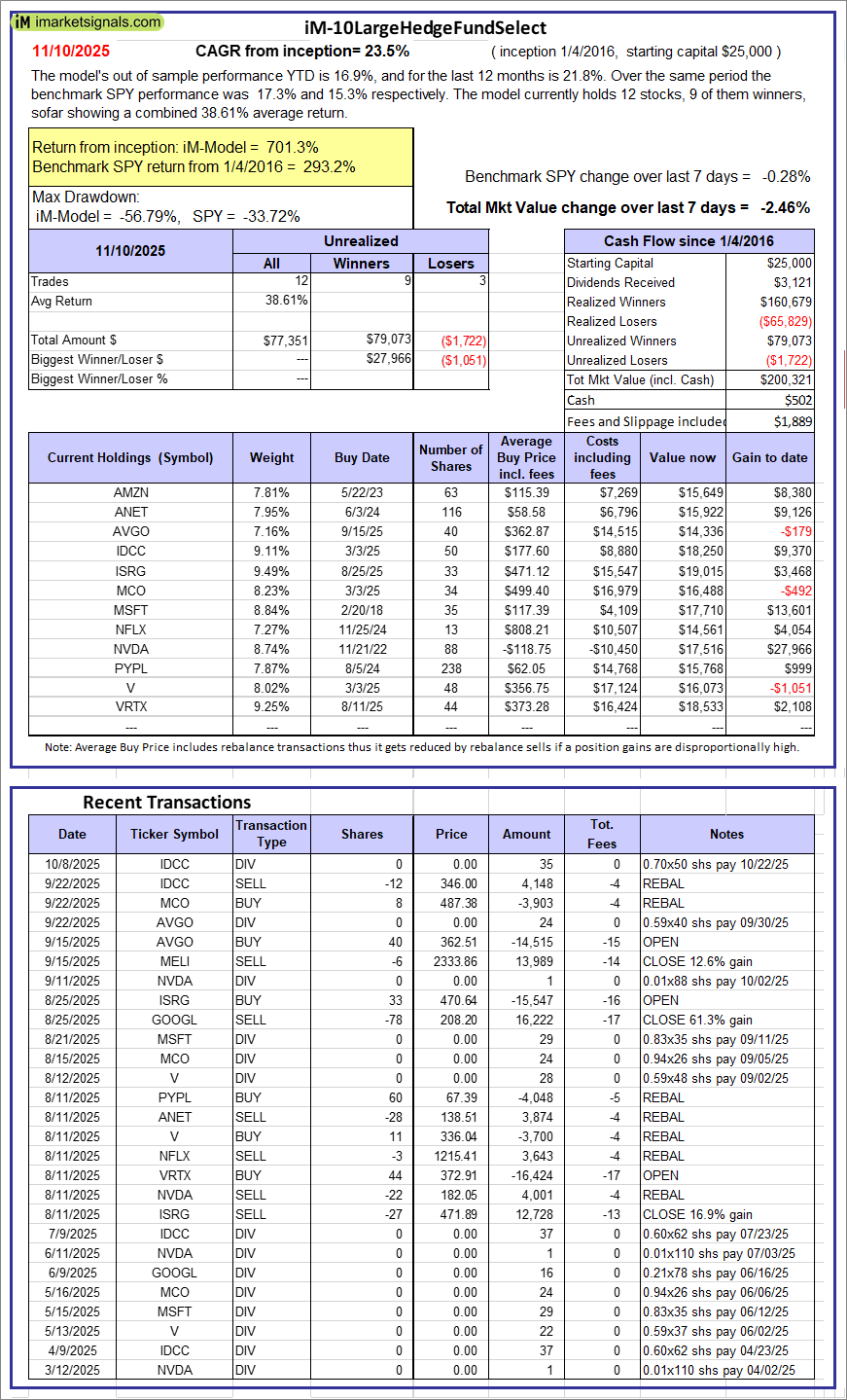 iM-10LargeHedgeFundSelect: Since inception, on 1/5/2016, the model gained 701.29% while the benchmark SPY gained 293.22% over the same period. Over the previous week the market value of iM-10LargeHedgeFundSelect gained -2.46% at a time when SPY gained -0.28%. A starting capital of $25,000 at inception on 1/5/2016 would have grown to $200,321 which includes $502 cash and excludes $1,889 spent on fees and slippage.