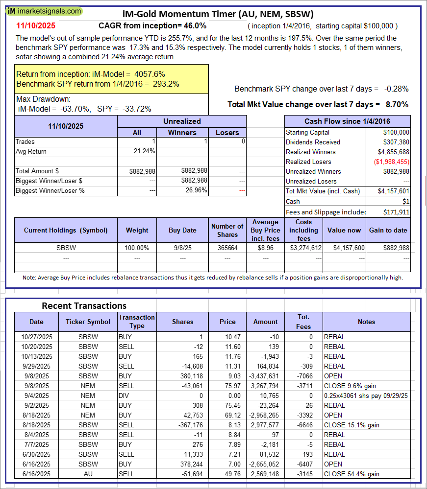 iM-Gold Momentum Timer (AU, NEM, SBSW): The model’s out of sample performance YTD is 277.9%, and for the last 12 months is 236.1%. Over the same period the benchmark SPY performance was 15.1% and 13.7% respectively. Over the previous week the market value of iM-Gold Momentum Timer (AU, NEM, SBSW) gained 9.82% at a time when SPY gained 0.46%. A starting capital of $100,000 at inception on 6/30/2016 would have grown to $01 which includes $171,911 cash and excludes Gain to date spent on fees and slippage.
