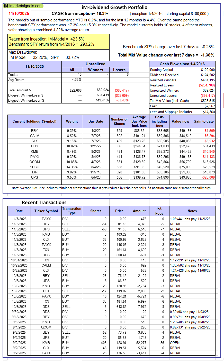 iM-Dividend Growth Portfolio: The model’s out of sample performance YTD is 8.2%, and for the last 12 months is 4.4%. Over the same period the benchmark SPY performance was 17.3% and 15.3% respectively. Over the previous week the market value of the iM-Dividend Growth Portfolio gained -1.38% at a time when SPY gained -0.28%. A starting capital of $100,000 at inception on 6/30/2016 would have grown to $523,515 which includes $2,567 cash and excludes $14,300 spent on fees and slippage.