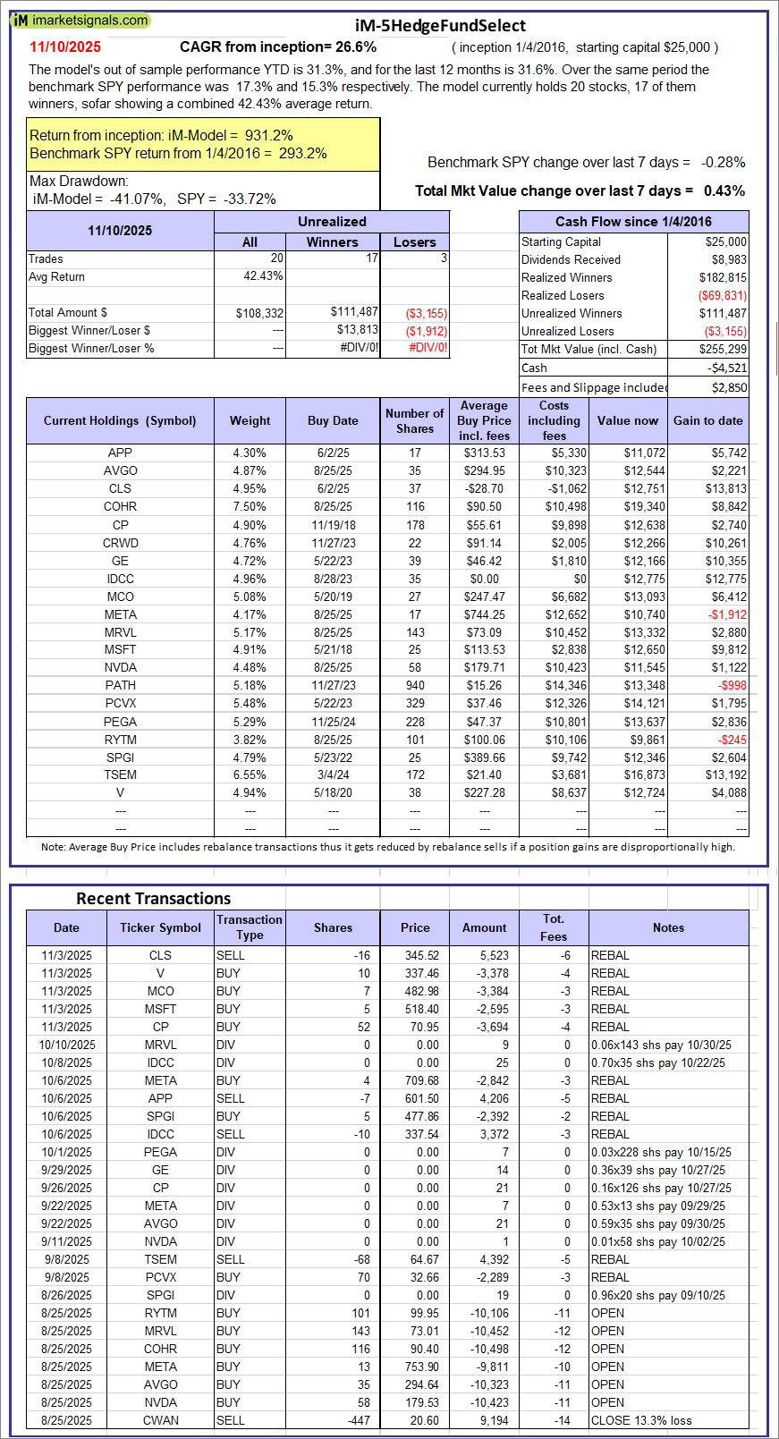iM-5HedgeFundSelect: Since inception, on 1/5/2016, the model gained 931.18% while the benchmark SPY gained 293.22% over the same period. Over the previous week the market value of iM-5HedgeFundSelect gained 0.43% at a time when SPY gained -0.28%. A starting capital of $25,000 at inception on 1/5/2016 would have grown to $255,299 which includes -$4,521 cash and excludes $2,850 spent on fees and slippage.