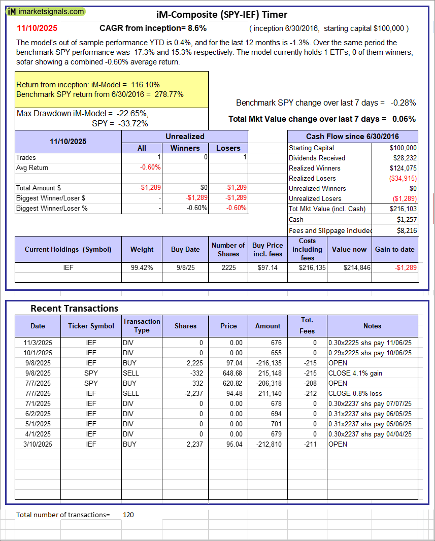 iM-Composite (SPY-IEF) Timer: The model’s out of sample performance YTD is 0.4%, and for the last 12 months is -1.3%. Over the same period the benchmark SPY performance was 17.3% and 15.3% respectively. Over the previous week the market value of the iM-Composite (SPY-IEF) Timer gained 0.06% at a time when SPY gained -0.28%. A starting capital of $100,000 at inception on 6/30/2016 would have grown to $216,103 which includes $1,257 cash and excludes $8,216 spent on fees and slippage.