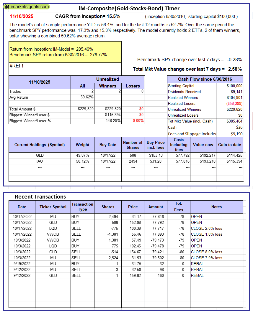 iM-Composite(Gold-Stocks-Bond) Timer: The model’s out of sample performance YTD is 56.4%, and for the last 12 months is 52.7%. Over the same period the benchmark SPY performance was 17.3% and 15.3% respectively. Over the previous week the market value of the iM-Composite(Gold-Stocks-Bond) Timer gained 2.58% at a time when SPY gained -0.28%. A starting capital of $100,000 at inception on 6/30/2016 would have grown to $385,464 which includes $36 cash and excludes $9,190 spent on fees and slippage.