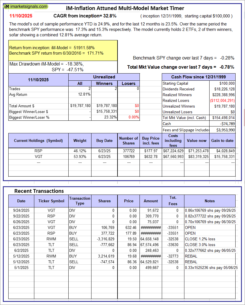 iM-Inflation Attuned Multi-Model Market Timer: The model’s out of sample performance YTD is 24.9%, and for the last 12 months is 23.5%. Over the same period the benchmark SPY performance was 17.3% and 15.3% respectively. Over the previous week the market value of the iM-Inflation Attuned Multi-Model Market Timer gained -0.78% at a time when SPY gained -0.28%. A starting capital of $100,000 at inception on 3/24/2017 would have grown to $154,498,014 which includes -$74,789 cash and excludes $3,953,990 spent on fees and slippage.
