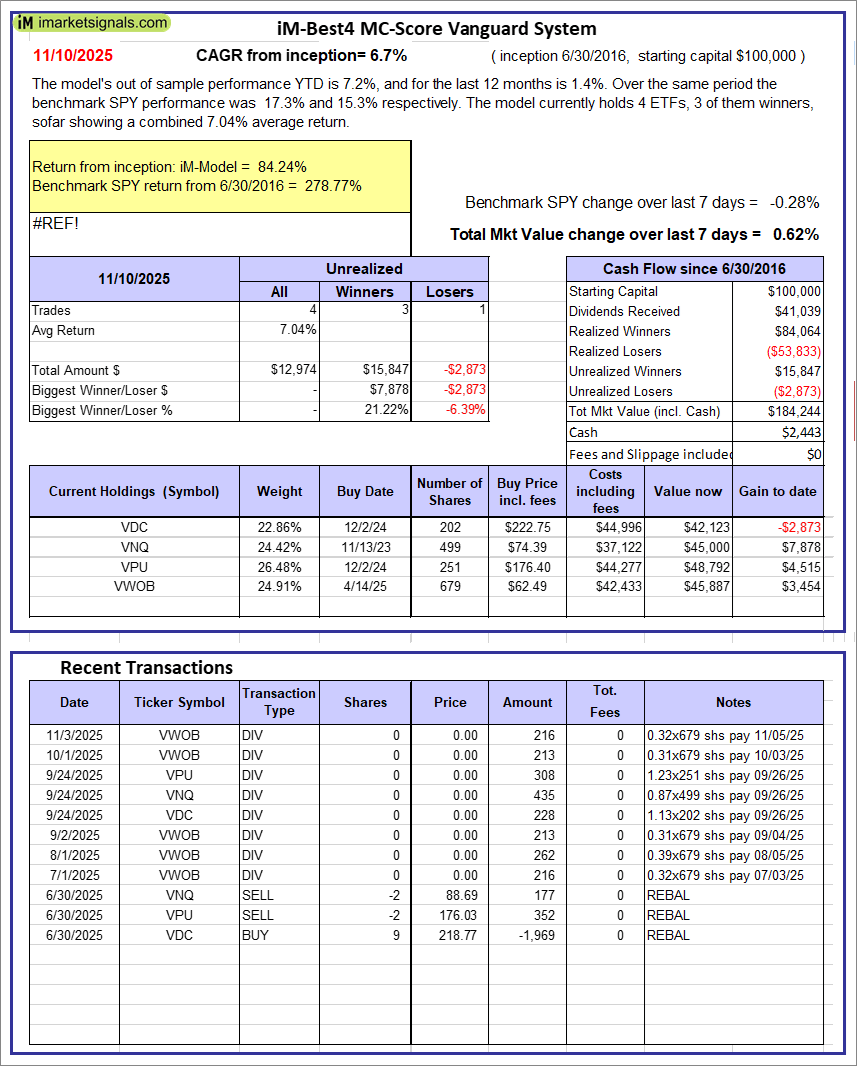 iM-Best4 MC-Score Vanguard System: The model’s out of sample performance YTD is 7.1%, and for the last 12 months is 1.6%. Over the same period the benchmark SPY performance was 15.1% and 13.7% respectively. Over the previous week the market value of the iM-Best4 MC-Score Vanguard System gained 0.29% at a time when SPY gained 0.46%. A starting capital of $100,000 at inception on 6/30/2016 would have grown to $184,043 which includes $2,443 cash and excludes $00 spent on fees and slippage.