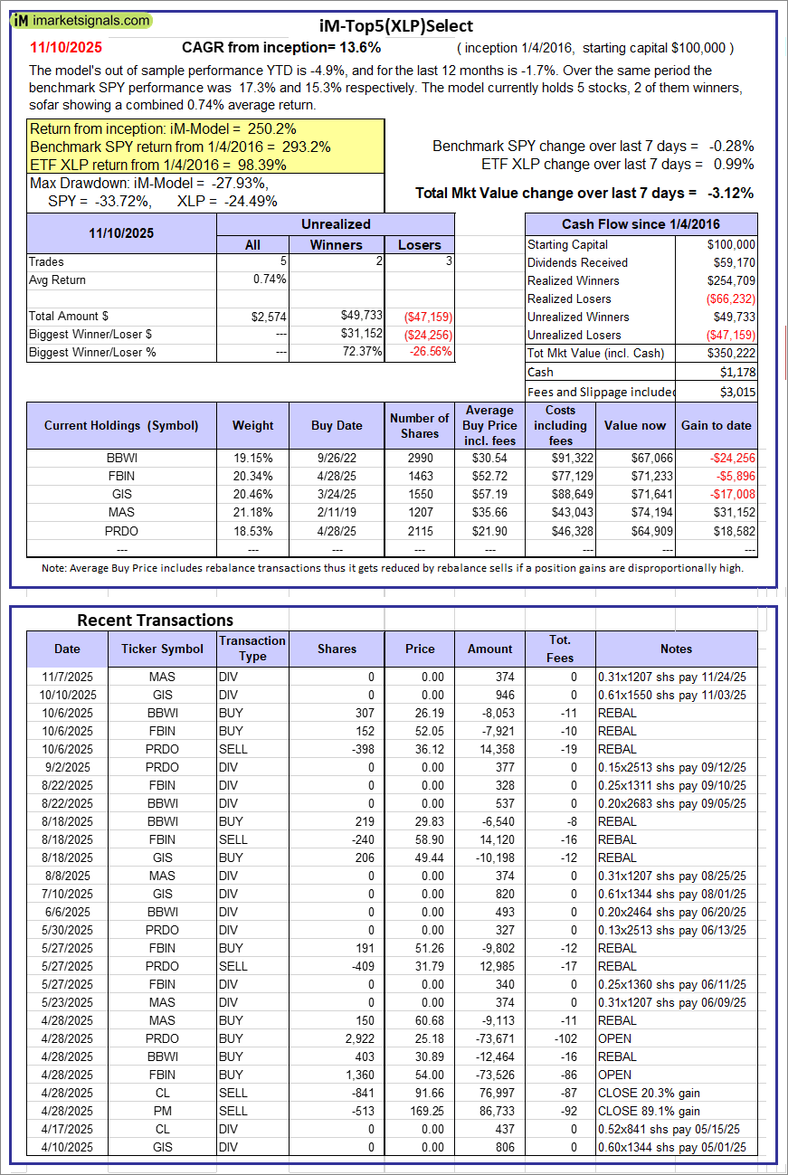 iM-Top5(XLP)Select: Since inception, on 1/5/2016, the model gained 250.22% while the benchmark SPY gained 293.22% over the same period. Over the previous week the market value of iM-Top5(XLP)Select gained -3.12% at a time when SPY gained -0.28%. A starting capital of $100,000 at inception on 1/5/2016 would have grown to $350,222 which includes $1,178 cash and excludes $3,015 spent on fees and slippage.
