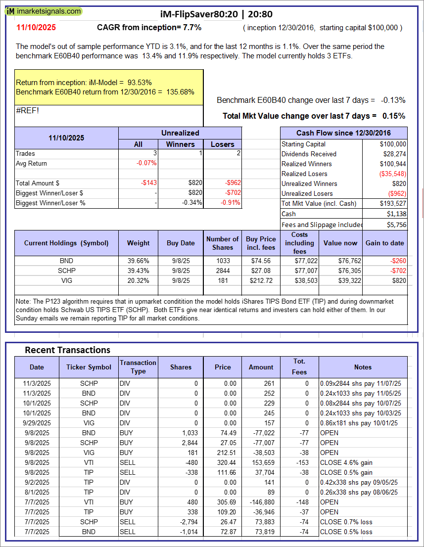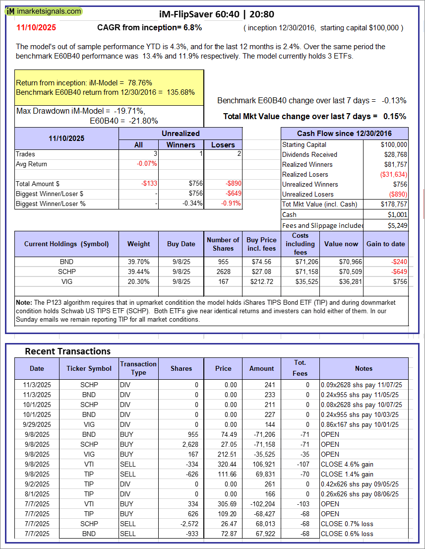 iM-Composite(Gold-Stocks-Bond) Timer: The model’s out of sample performance YTD is 6.5%, and for the last 12 months is 70.2%. Over the same period the benchmark SPY performance was 1.9% and 21.2% respectively. Over the previous week the market value of the iM-Composite(Gold-Stocks-Bond) Timer gained 3.31% at a time when SPY gained 1.08%. A starting capital of $100,000 at inception on 6/30/2016 would have grown to $430,235 which includes $36 cash and excludes $9,190 spent on fees and slippage.