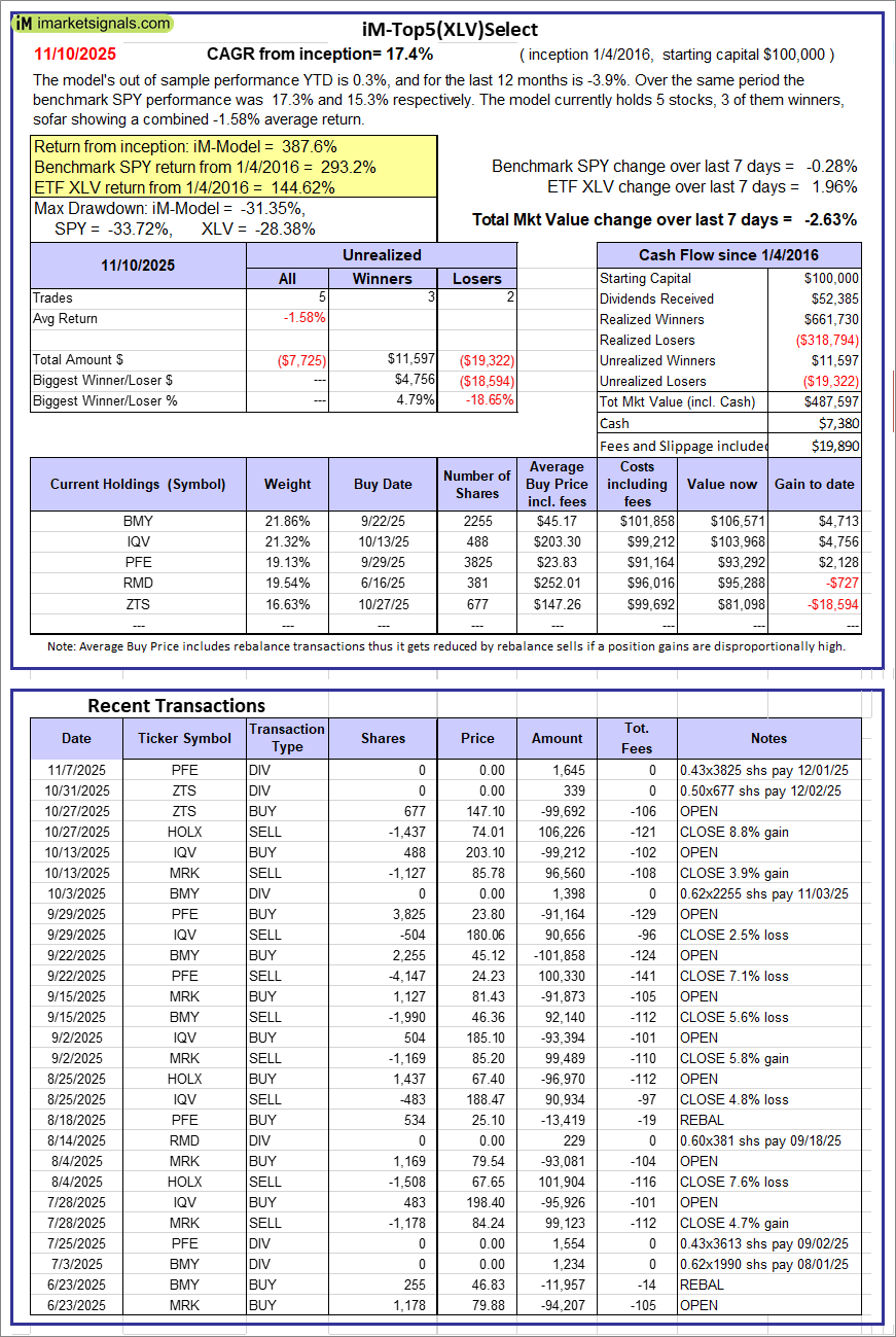 iM-Top5(XLV)Select: Since inception, on 1/5/2016, the model gained 387.60% while the benchmark SPY gained 293.22% over the same period. Over the previous week the market value of iM-Top5(XLV)Select gained -2.63% at a time when SPY gained -0.28%. A starting capital of $100,000 at inception on 1/5/2016 would have grown to $487,597 which includes $7,380 cash and excludes $19,890 spent on fees and slippage.