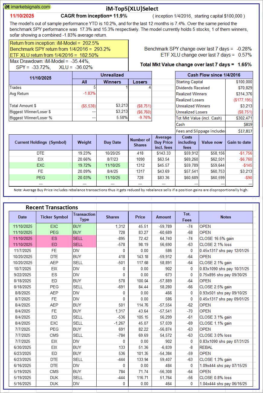 iM-Top5(XLU)Select: Since inception, on 1/5/2016, the model gained 202.47% while the benchmark SPY gained 293.22% over the same period. Over the previous week the market value of iM-Top5(XLU)Select gained 1.65% at a time when SPY gained -0.28%. A starting capital of $100,000 at inception on 1/5/2016 would have grown to $302,471 which includes $819 cash and excludes $17,817 spent on fees and slippage.