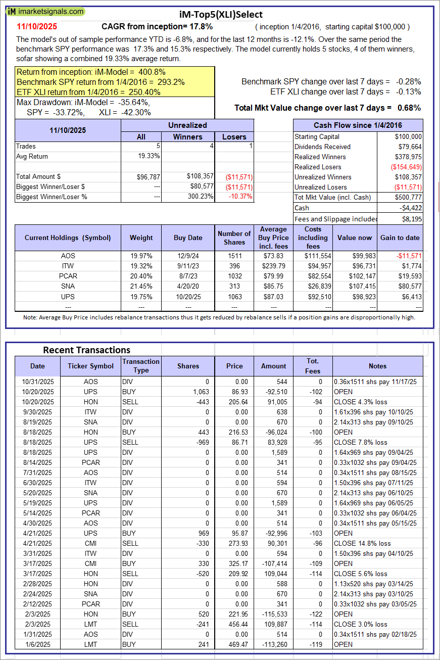 iM-Top5(XLI)Select: Since inception, on 1/5/2016, the model gained 400.78% while the benchmark SPY gained 293.22% over the same period. Over the previous week the market value of iM-Top5(XLI)Select gained 0.68% at a time when SPY gained -0.28%. A starting capital of $100,000 at inception on 1/5/2016 would have grown to $500,777 which includes -$4,422 cash and excludes $8,195 spent on fees and slippage.