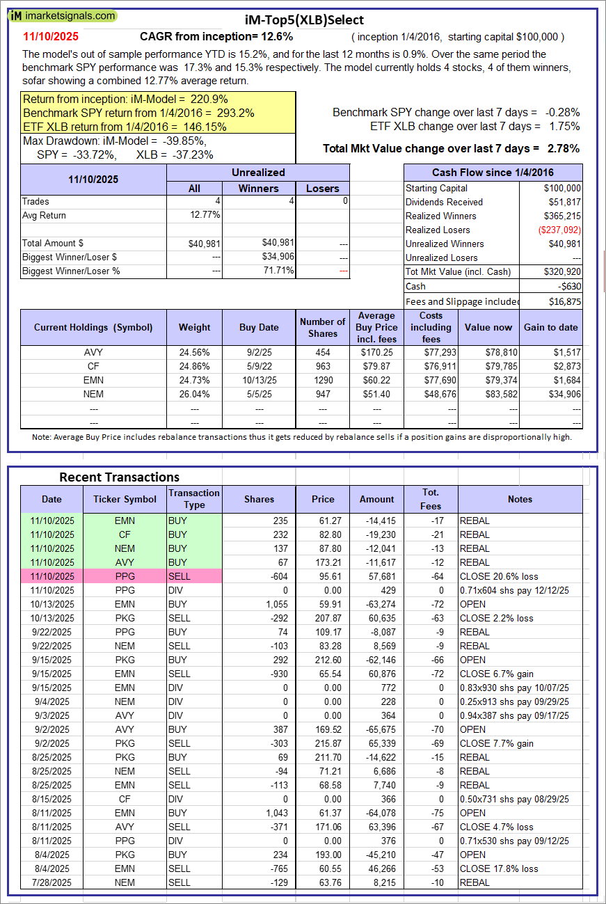 iM-Top5(XLB)Select: Since inception, on 1/5/2016, the model gained 220.92% while the benchmark SPY gained 293.22% over the same period. Over the previous week the market value of iM-Top5(XLB)Select gained 2.78% at a time when SPY gained -0.28%. A starting capital of $100,000 at inception on 1/5/2016 would have grown to $320,920 which includes -$630 cash and excludes $16,875 spent on fees and slippage.