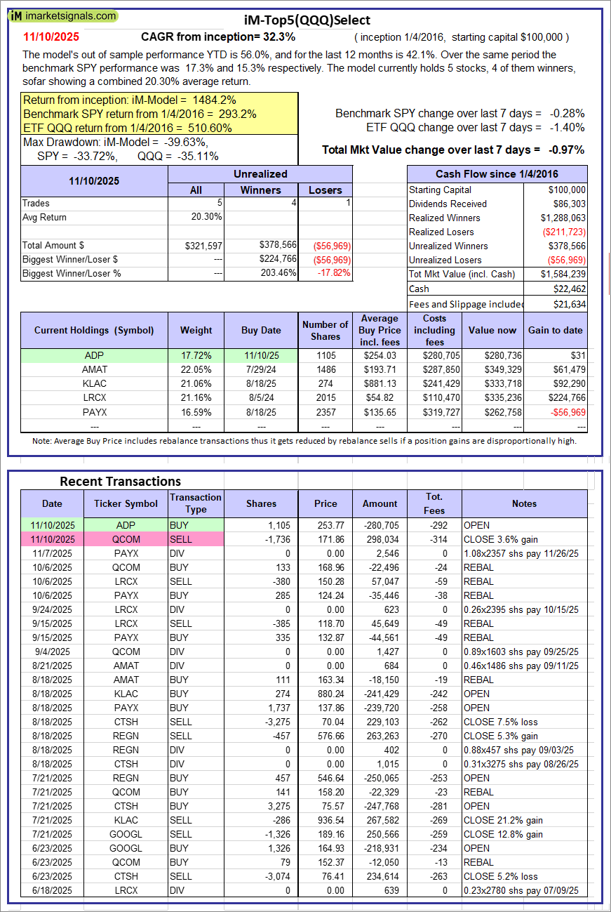iM-Top5(QQQ)Select: Since inception, on 1/5/2016, the model gained 1484.24% while the benchmark SPY gained 293.22% over the same period. Over the previous week the market value of iM-Top5(QQQ)Select gained -0.97% at a time when SPY gained -0.28%. A starting capital of $100,000 at inception on 1/5/2016 would have grown to $1,584,239 which includes $22,462 cash and excludes $21,634 spent on fees and slippage.