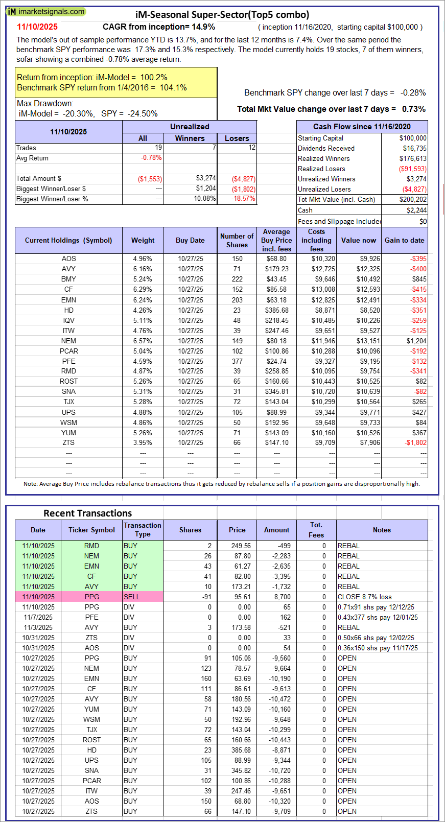 iM-Seasonal Super-Sectors (Top5 combo) : Since inception, on 11/17/2020, the model gained 100.20% while the benchmark SPY gained 104.12% over the same period. Over the previous week the market value of iM-Seasonal Super-Sectors (Top5 combo) gained 0.73% at a time when SPY gained -0.28%. A starting capital of $100,000 at inception on 11/17/2020 would have grown to $200,202 which includes $2,244 cash and excludes $00 spent on fees and slippage.