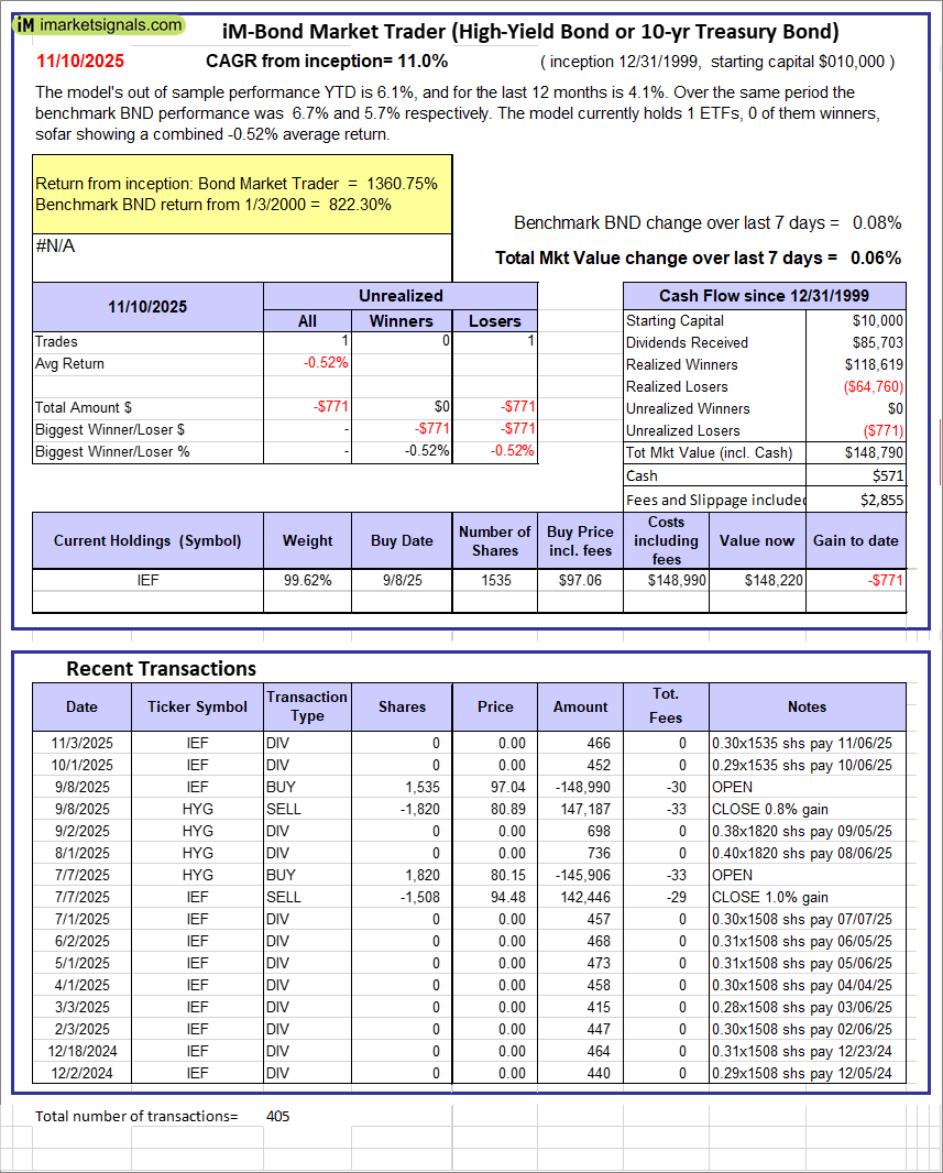 iM-Bond Market Trader (High-Yield Bond or 10-yr Treasury Bond): The model’s out of sample performance YTD is 7.0%, and for the last 12 months is 6.4%. Over the same period the benchmark BND performance was 7.2% and 6.9% respectively. Over the previous week the market value of the iM-Bond Market Trader (High-Yield Bond or 10-yr Treasury Bond) gained 0.82% at a time when BND gained 0.61%. A starting capital of $10,000 at inception on 1/3/2000 would have grown to $149,987 which includes $571 cash and excludes $2,855 spent on fees and slippage.