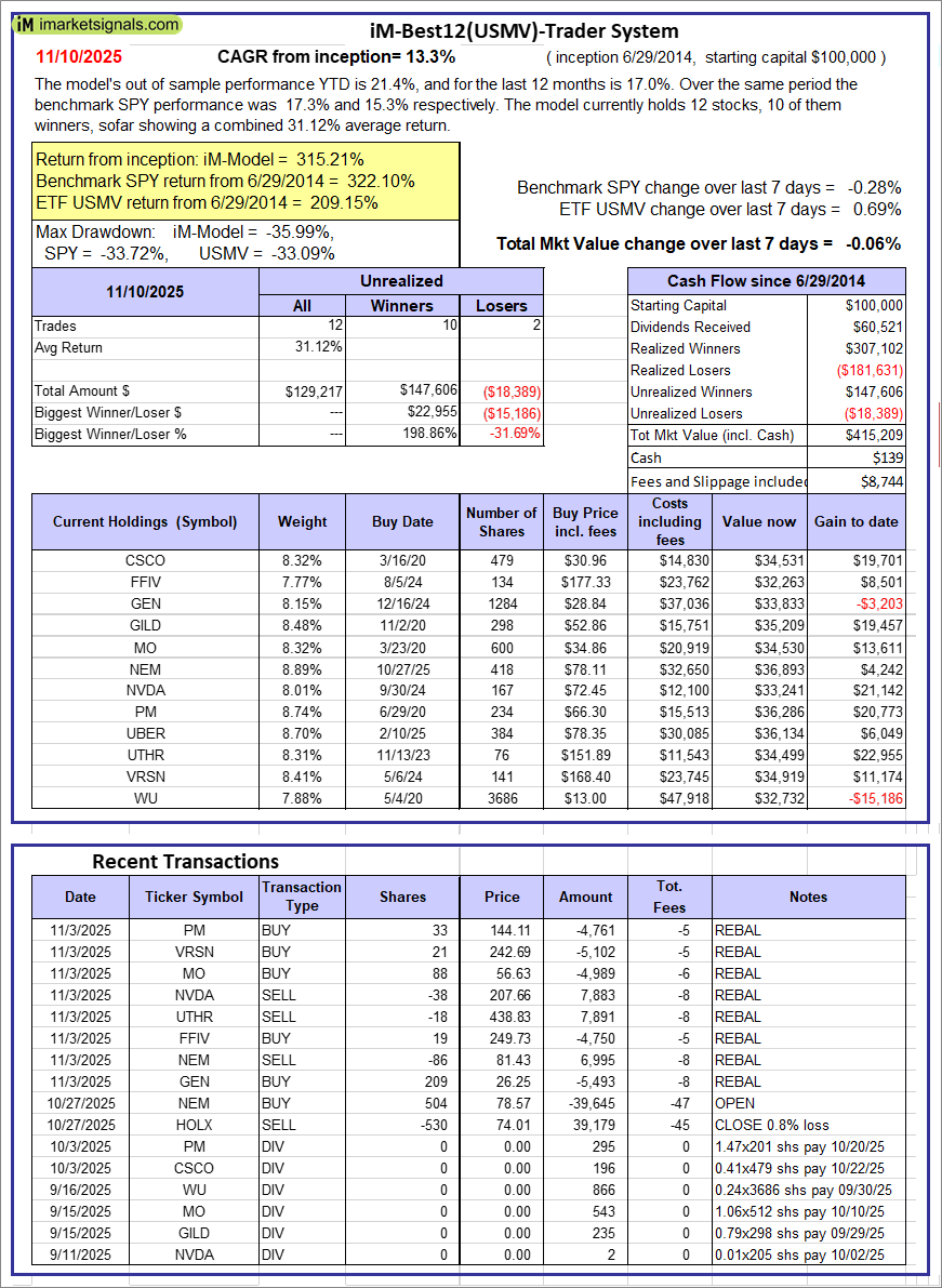 iM-Best12(USMV)-Trader: The model’s out of sample performance YTD is 21.4%, and for the last 12 months is 17.0%. Over the same period the benchmark SPY performance was 17.3% and 15.3% respectively. Since inception, on 6/30/2014, the model gained 315.21% while the benchmark SPY gained 322.10% and the ETF USMV gained 209.15% over the same period. Over the previous week the market value of iM-Best12(USMV)-Trader gained -0.06% at a time when SPY gained -0.28%. A starting capital of $100,000 at inception on 6/30/2014 would have grown to $415,209 which includes $139 cash and excludes $8,744 spent on fees and slippage.