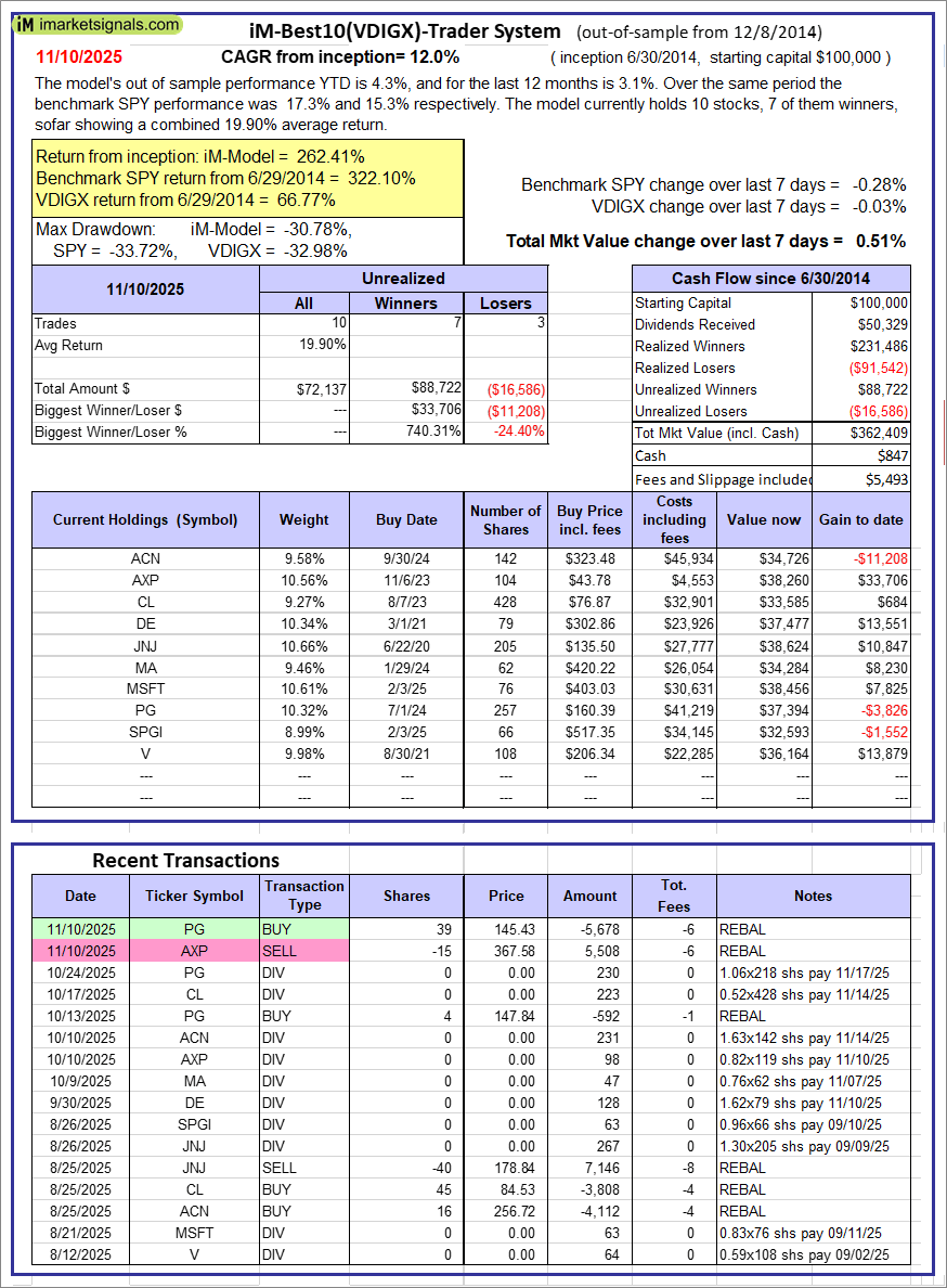 iM-Best10(VDIGX)-Trader: The model’s out of sample performance YTD is 4.3%, and for the last 12 months is 3.1%. Over the same period the benchmark SPY performance was 17.3% and 15.3% respectively. Since inception, on 7/1/2014, the model gained 262.41% while the benchmark SPY gained 322.10% and VDIGX gained 66.77% over the same period. Over the previous week the market value of iM-Best10(VDIGX) gained 0.51% at a time when SPY gained -0.28%. A starting capital of $100,000 at inception on 7/1/2014 would have grown to $362,409 which includes $847 cash and excludes $5,493 spent on fees and slippage.