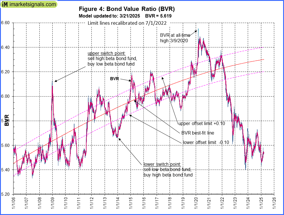 11/7/2025: To view latest update please log in 8/22/2025: The BVR-model favors high beta bonds (long-bonds) and intermediate duration bonds when the BVR rises. The Bond Value Ratio as shown in Fig 4 is above last week’s value, and according to the model, only when BVR turns upward after having been lower than the lower offset-line should one consider long bonds again. |