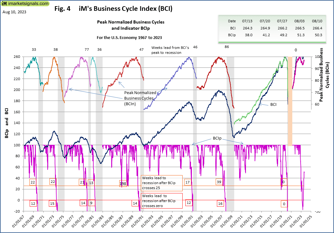 Also, the index BCI retreats from its cyclic peak before a recession in a well-defined manner. This is the basis for the alternative indicator BCIp (and its variant BCIw) which gives an average 20-week leading signal to the next recession when BCIp falls below 25.